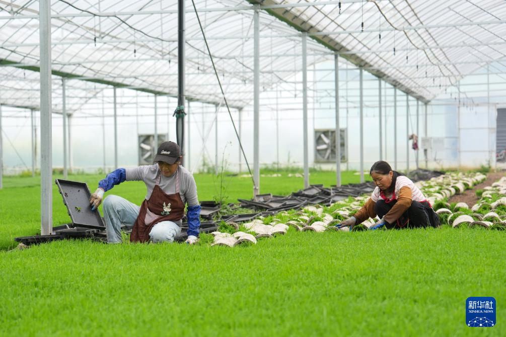 4月16日,在湖南省益阳市南县南洲镇,工人在育秧大棚内整理早稻秧苗。新华社记者 陈振海 摄