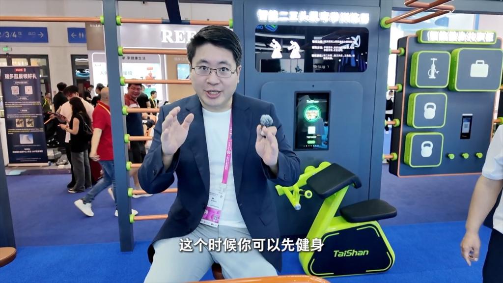 当你在等公交车时可能会无聊,这个时候你可以先健身,同时如果你手机没电了,还可以在这个区域进行手机充电。如果天下雨了,还可以借这里的共享雨伞。这是第六届消博会现场泰山体育展出的全球首发产品“城市健康智慧服务中心”,模拟的场景是未来的公交站台。